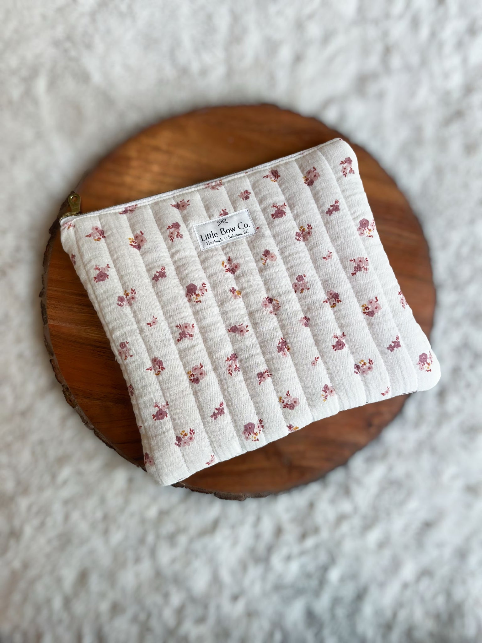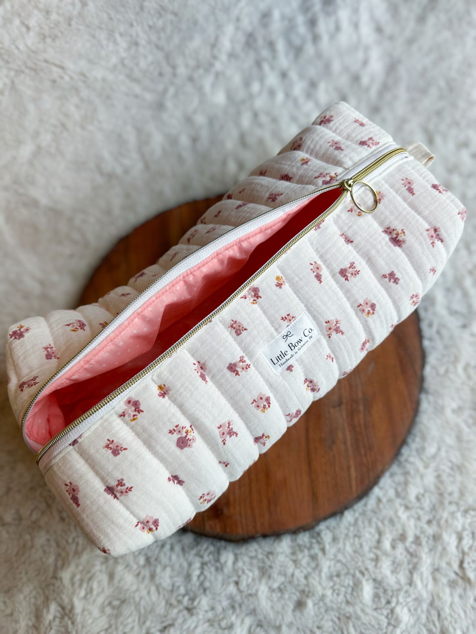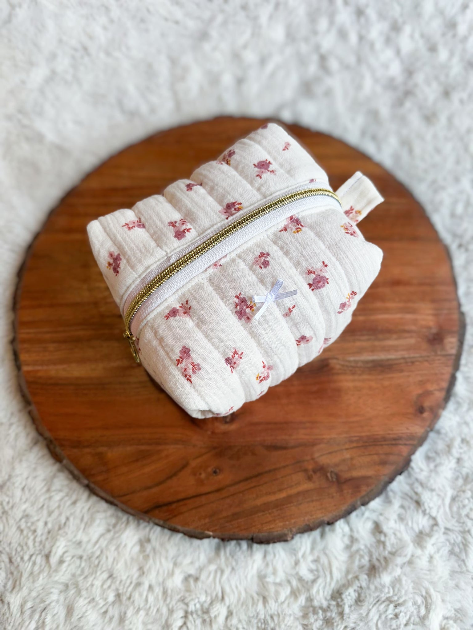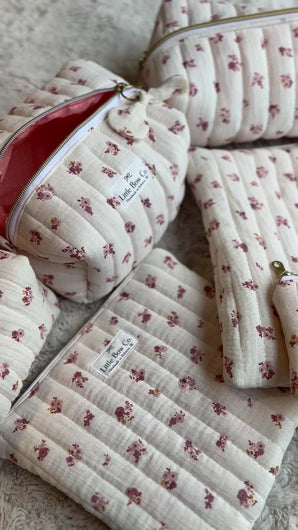 California girl collection is made to order, orders will be fulfilled within approximately 7 days. All bags in this collection are 100% cotton muslin, lined with a coral 100% cotton fabric. Box bags are lined with polka dot coral fabric, and flat pouches are lined with the same coral but gingham. Seamless interior, with a gold zipper