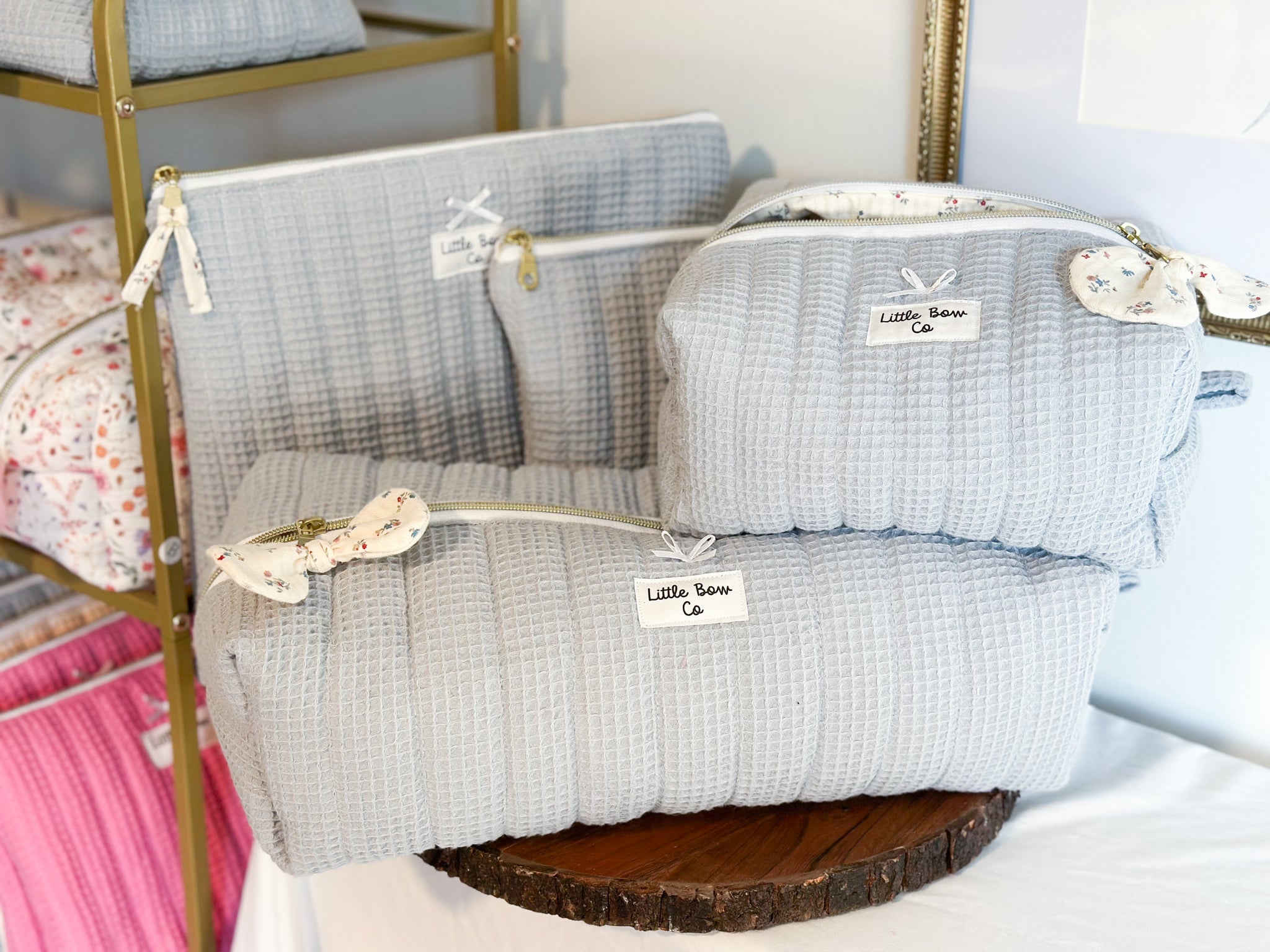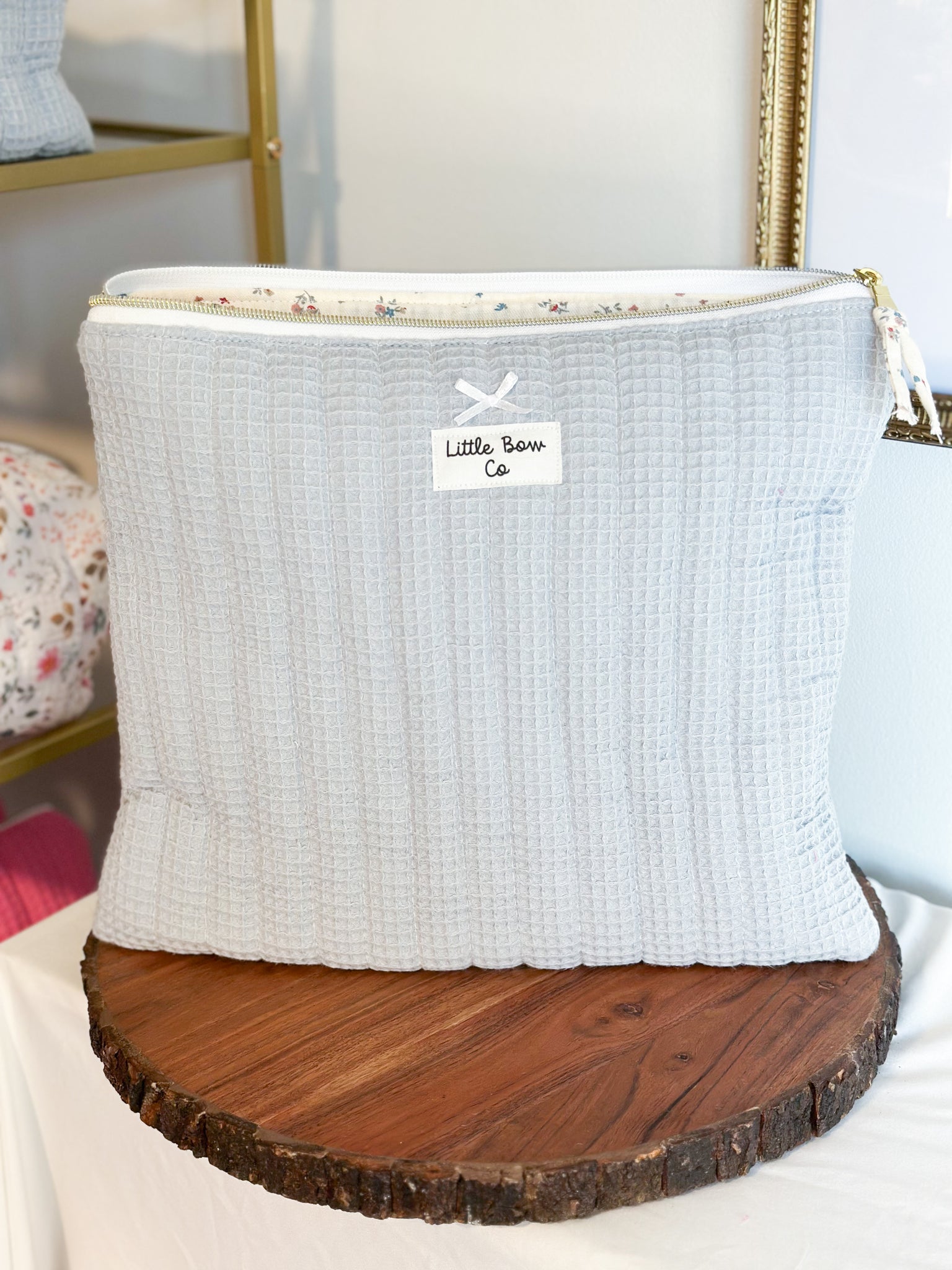 - dimensions for hair tools bag (in inches) 18x9x8, beauty tote 11x9x8, zip pouch (small) 9x11x1, large zipped pouch 12x12x1