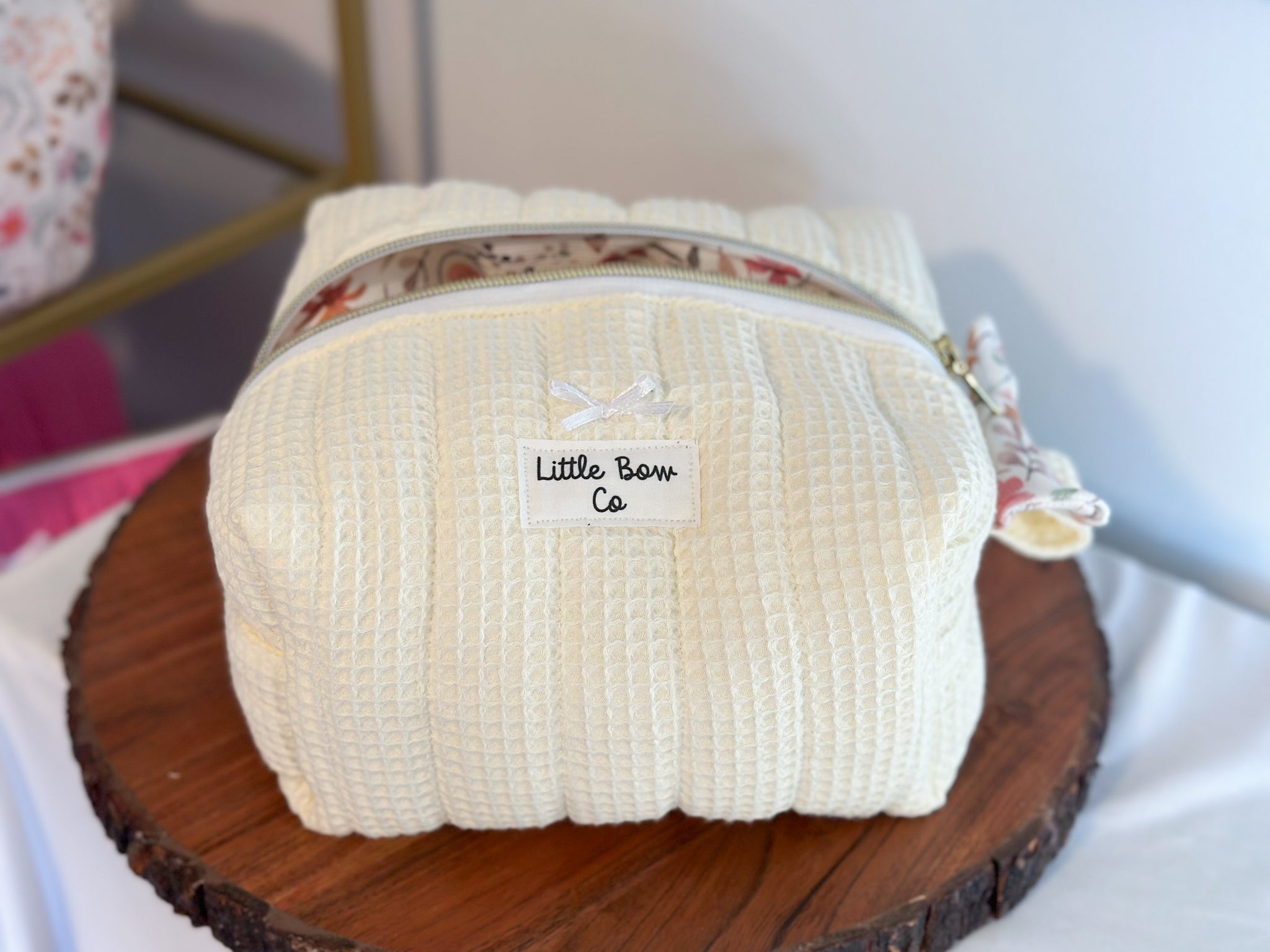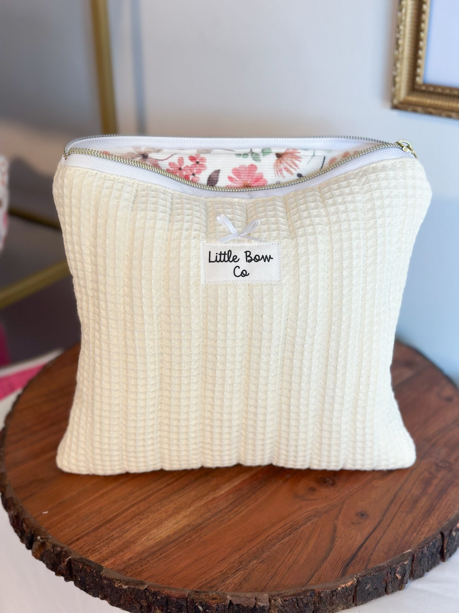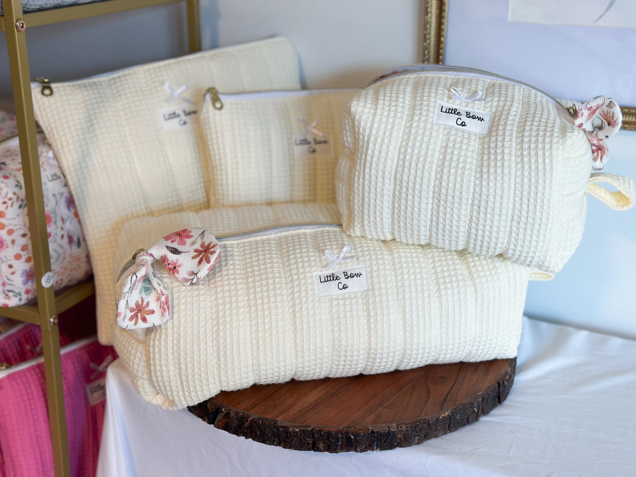- dimensions for hair tools bag (in inches) 18x9x8, beauty tote 11x9x8, zip pouch (small) 9x11x1 and zipped pouches (large) 12x12x1